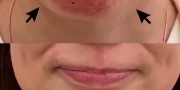 Напряжение подбородочной мышцы как на видео «до» обычно внешне сравнивается с персиковой косточкой — подбородок выглядит таким же бугристым и к тому же поджимается вверх и уплощается