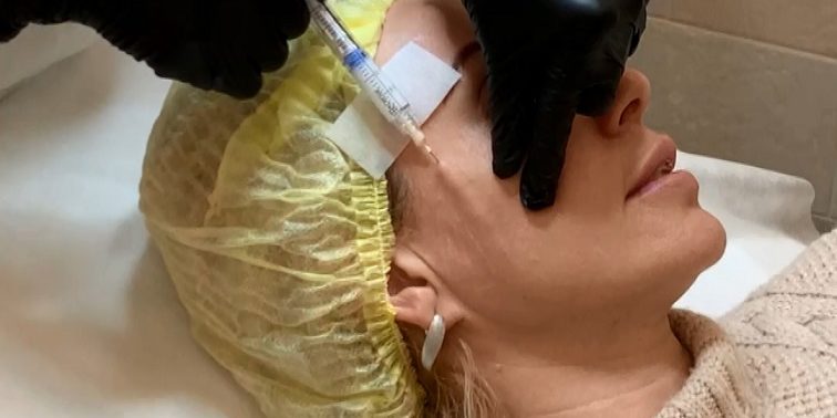 - мягкий лифтинг тканей лица, путём введения препарата под волосистую часть головы (над ухом и в зоне виска)